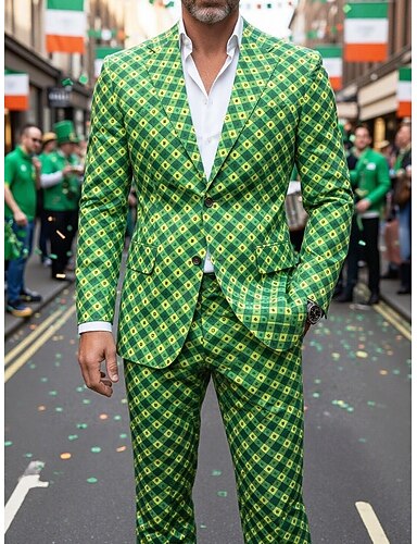 Per uomo Blazer + pantaloni eleganti Blazer Completi Affari Lavoro Feste Moda Festa di San Patrizio Primavera Autunno 100% Cotone Trifoglio Geometria Stampa Monopetto Giacca Verde