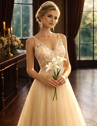 Firmato da Wedding Beach Abiti da Sposa Formali A-Line V Neck Maniche Lunghe Strascico Corte Tulle Gonne da Sposa con Pieghe Applicazioni