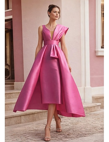 Due Pezzi Linea ad A Lunghezza Tè Abiti da Cocktail Elegante Abiti semi formali Senza Maniche Scollo a V Festa in giardino Matrimonio Raso con Fiocco/Fiocchi Pieghe