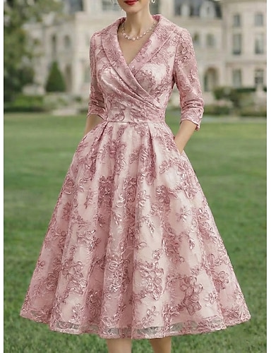 Linea ad A Abito Lunghezza alla caviglia Lunghezza Tè Abito da Cocktail Abito da cerimonia per signora Manica 3/4 Scollo a V Bavero Elegante Lussuoso Casual Formale Ospite di nozze Semi-Formale Pizzo