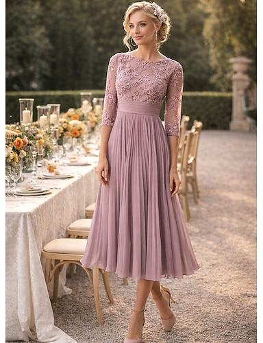 Linea ad A Lunghezza Tè Vestito da Festa Abito da Cocktail Abito da invitata a nozze Abito da cerimonia per signora Manica 3/4 Girocollo Elegante Ospite di nozze Festa di fidanzamento Chiffon Pizzo