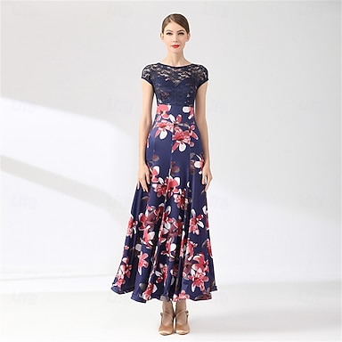 Linea ad A Lunghezza al pavimento Abito da cerimonia per signora Manica Corta Girocollo Elegante Vintage Lussuoso Formale Ospite di nozze Ricevimento di matrimonio Chiffon Pizzo Tulle con Stampa