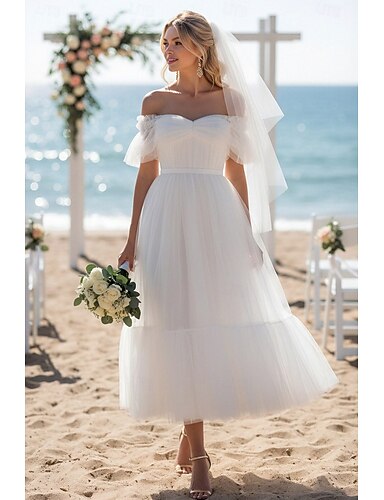 Linea ad A Lunghezza alla caviglia Abito da laurea Vestito da Festa Abito da Cocktail Abiti da sposa Abito da sposa Elegante Piccoli Abiti Bianchi Manica Corta Senza Spalle Matrimonio Laurea Tulle