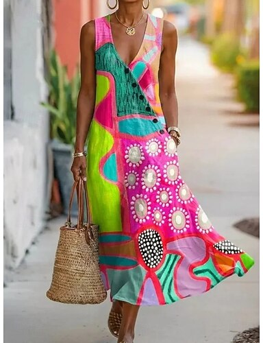 Per donna Abito maxi Abito Boho Abito Camicia Vestito Estivo Elegante Bohemien Etnico Spiaggia Ferie Vestibilità regolare Grafico Geometrico Senza Maniche Scollo a V Blu Rosa Estate Primavera