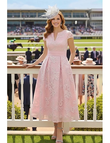 Abito da festa a lunghezza tè A-Line Abito da cocktail Abito per ospiti di matrimonio Abito per la madre della sposa Maniche corte Collo dritto Elegante Vintage Formale Ospite di matrimonio con
