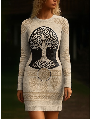 Vestito corto vintage vichingo da donna, in maglia, casual, boho, casual, quotidiano, per le vacanze, sottile, grafico, tribale, a maniche lunghe, girocollo, beige, autunno inverno