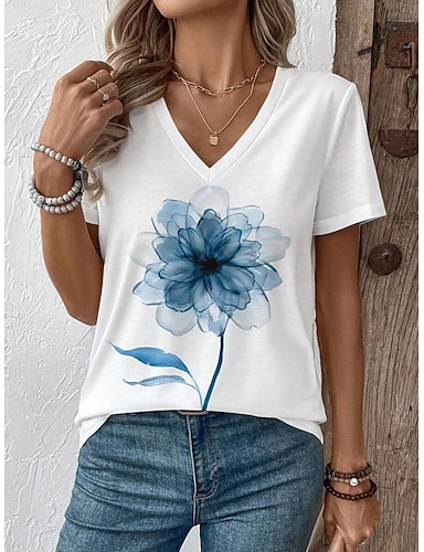Per donna Maglietta Stampato Floreale Grafico Piante Elegante Classico Casual Manica Corta Scollo a V Top Regolari Quotidiano Blu Rosso Viola Verde Estate Primavera