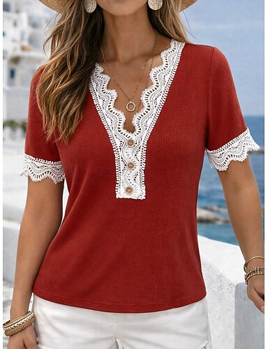 Per donna Top a maglia waffle Bordi in pizzo Semplice Elegante Classico Manica Corta Scollo a V Top Regolari Casuale Quotidiano Blu Rosso Viola chiaro Estate Primavera
