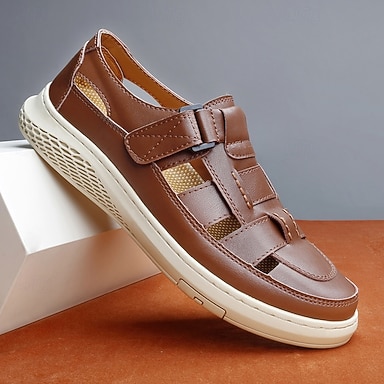 Sandali da pescatore da uomo in similpelle marrone, scarpe casual a punta chiusa con cinturino a strappo, ideali per l'uso quotidiano, i viaggi, la guida, il tempo libero all'aperto e un look casual estivo comodo.