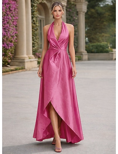 Linea ad A Lunghezza Tè Abiti da Cocktail Elegante Alto Basso Senza Maniche Scollo a V Festa in giardino Matrimonio Raso Taffetà Senza schiena con Pieghe