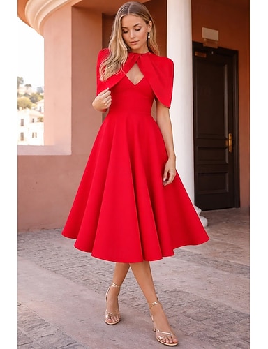 Linea ad A Lunghezza Tè Vestito da Festa Abito da Cocktail Abito da invitata a nozze Abito da cerimonia per signora Senza Maniche Scollo a V Elegante Abito Nero Formale Ospite di nozze Raso con