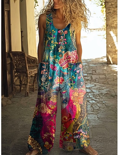 Per donna Tuta Attivo Floreale Senza Maniche Senza maniche Gamba larga Collo a U Tasca Bottoni Quotidiano Vacanza Vestibilità comoda Verde Estate