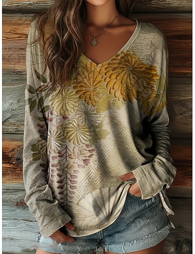 Per donna Maglietta Stampato Floreale Grafico Vintage Casual Boho Manica Lunga Scollo a V Top Regolari Quotidiano Cachi Primavera Autunno
