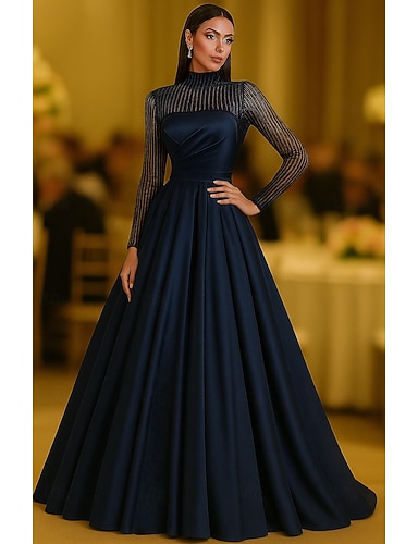 Linea ad A Lunghezza al pavimento Perline ricamate Abito Formale Abito da madre della sposa Abito da Sera Da principessa Abito formale Elegante Scintillante Manica Lunga Collo Alto Matrimonio Formale