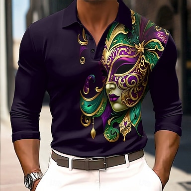 Carnevale Per uomo Maschera Polo Manica Lunga Magliette polo Camicie con Colletto Vintage Abito da festa Stampa 3D Primavera Autunno Inverno Nero