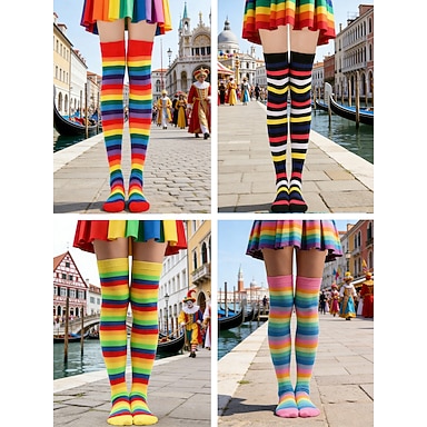 Calze sopra il ginocchio colorate da Carnavale per il Mardi Gras - Set da 4 paia di calze a righe elastiche per donne stile vibrante per outfit di Carnevale e feste