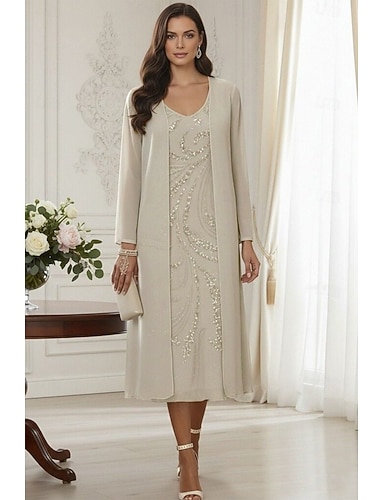 Due Pezzi Linea ad A Lunghezza Tè Perline ricamate Abito da invitata a nozze Abito Formale Abito da cerimonia per signora Senza Maniche Scollo a V Elegante Formale Ospite di nozze Chiffon Pizzo Abiti