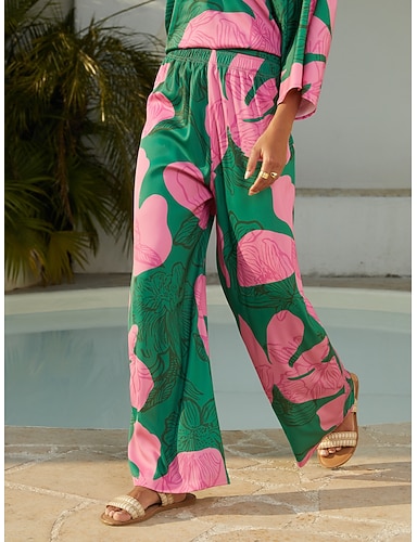 pantaloni larghi in raso con stampa floreale geometrica casual da vacanza