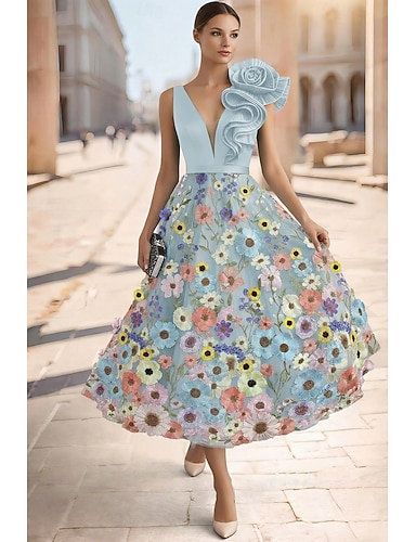 Linea ad A Lunghezza Tè Abiti da Cocktail Elegante Vintage Floreale Senza Maniche Scollo a V Festa in giardino Matrimonio Tasca Raso Pizzo con Fiore ricamato Ricamo Tasca