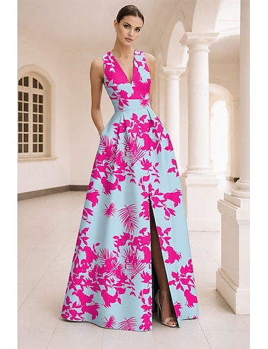 Linea ad A Lunghezza al pavimento Abito da Sera Abito formale Elegante Spacco Alto Madre della sposa Senza Maniche Scollo a V Formale Ospite di nozze Vestito Rosa Raso con Stampa floreale Spacco Tasca