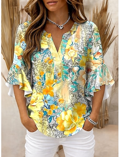 Per donna Camicia Stampato Floreale Elegante Manica 3/4 Girocollo Top Regolari Quotidiano Ferie Giallo Vino Verde Estate