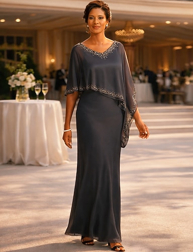 Linea ad A Abito Lunghezza al pavimento Abito da invitata a nozze Abito Formale Abito da sera Abito da cerimonia per signora Mezza Manica Scollo a Cascata Elegante Formale Riunione di famiglia Chiffon