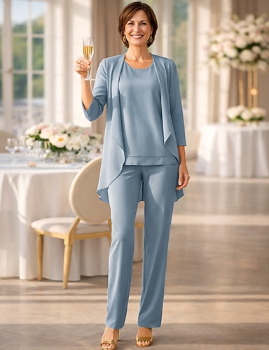 Tuta Completo Pantalone Tre Pezzi Completo Pantalone Lunghezza al pavimento Abito da cerimonia per signora Manica Lunga Collo quadrato Elegante Vintage Semplice Formale Ospite di nozze Chiffon Raso