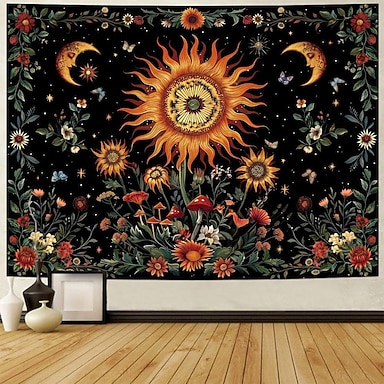 Arazzo da parete con sole e luna, girasole, fungo, farfalla, stile boho, arte murale estetica celeste per sala yoga, spazio di meditazione, camera da letto