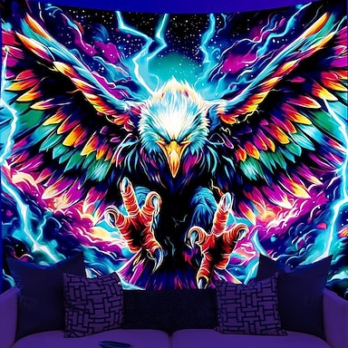 Arazzo sospeso con luce nera raffigurante un'aquila elettrica con ali spiegate e un motivo a fulmini, perfetto per l'arredamento psichedelico di una stanza o di un dormitorio