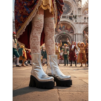 stivali da donna con plateau in metallo argentato, tacchi spessi e cerniera - stile disco anni '80, calzature da festa alla moda per serate fuori e balli