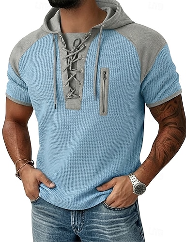 Per uomo Maglia Henley a nido d'ape Maglietta Manica Corta Con Cappuccio Collo con lacci Estate Primavera Tutte le stagioni Patchwork Moda Designer Casual Blocco di colore Casuale Quotidiano