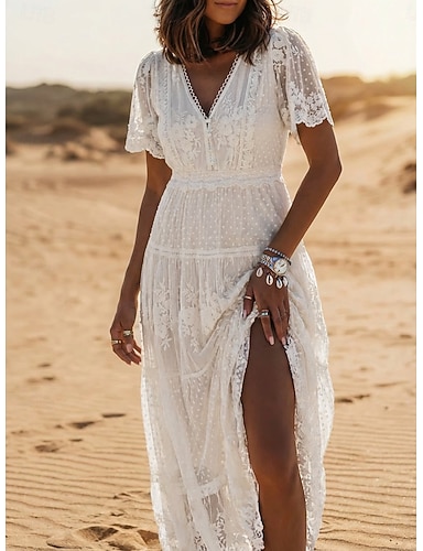 Per donna Abito maxi Abito Boho Abito in Pizzo Abito Bianco Abito Estivo Elegante Moda Spiaggia Vacanza Ferie Vestibilità regolare Floreale Mezza Manica Scollo a V Bianco Estate Primavera