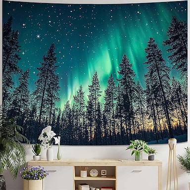 arazzo da parete aurora boreale luci del nord cielo notturno cielo stellato paesaggio forestale arazzo da parete silhouette di pino grande poster in tessuto per soggiorno camera da letto dormitorio