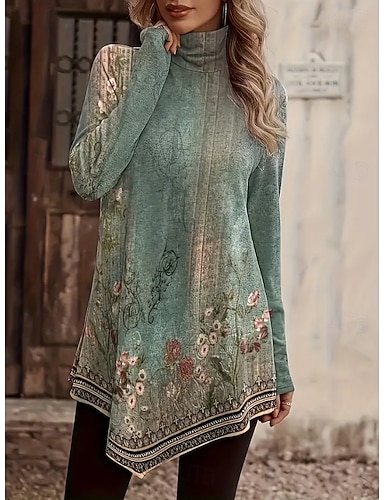 Per donna Maglietta Stampato A Strati Floreale Grafico Piante Elegante Vintage Casual Manica Lunga Collo Alto Collo asimmetrico Top Regolari Quotidiano Blu Arancione Primavera Autunno Inverno
