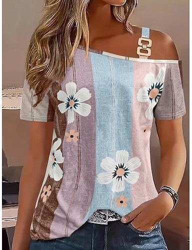 Per donna Maglietta Stampato Floreale Grafico Piante Vintage Elegante Classico Manica Corta Collo asimmetrico Top Regolari Quotidiano Uscire Weekend Viola chiaro Verde Estate Primavera
