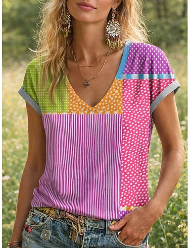 Per donna Maglietta Stampato Grafico Plaid Bohemien Vintage Casual Manica Corta Scollo a V Top Regolari Quotidiano Rosa Estate Primavera