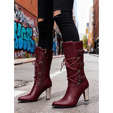stivali da donna alla moda punk bordeaux con lacci, fibbie e tacchi a blocco metallici: moda urbana alla moda per occasioni casual, di strada e serate fuori