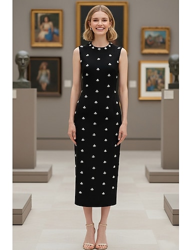 Abito da festa in stile colonna lungo fino al tè abito da cocktail abito per invitati a matrimoni abito per madri della sposa senza maniche collo a girocollo elegante vintage abito nero con perle e