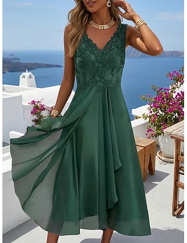 Linea ad A Abito Lunghezza Tè Vestito da Festa Abito da Cocktail Abito da invitata a nozze Abito da cerimonia per signora Manica Corta Scollo a V Elegante Vintage Festa Ospite di nozze Ferie Serata