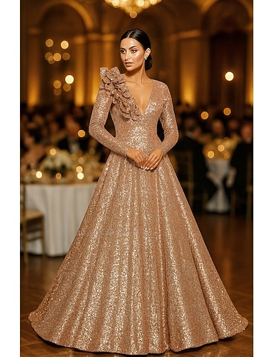 Linea ad A Lunghezza al pavimento Abito da Sera Abito formale Elegante Brillanti Manica Lunga Scollo a V Matrimonio Formale Con Paillettes con Glitter Paillettes