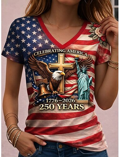 T-shirt patriottica per donne del Giorno dell'Indipendenza anniversario americano 250° stampa grafica bandiera bandiera americana vintage stilosa classica maniche corte colletto a V top regolari