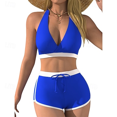 Womens Tankini 2 Pezzo Costume da Bagno Boy Leg Controllo Pancia Alta Vita Slim Schiena Nuda Vacanza Mare Wear Geometrico Stripes Halter Neck Senza Maniche Costumi da Bagno