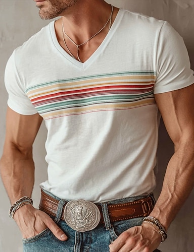 T-shirt da uomo vintage multicolore a righe orizzontali sul petto, stile retrò anni '70/'80, scollo a V, vestibilità grafica, maniche corte, estiva, casual, da spiaggia, abbigliamento di design per