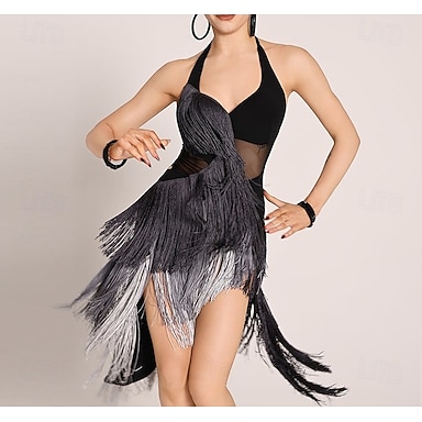 abito da ballo latino da donna con frange sfumate grigio-nero - pannello in rete con scollo all'americana per spettacoli da sala asimmetrici
