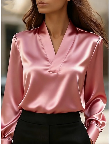 Per donna Camicia Elegant Elegante Top in raso Arricciato Tinta unica Affari Moderno Casual Manica Lunga Scollo a V Top Regolari Lavoro Abbigliamento Formale Nero Rosa Estate Primavera