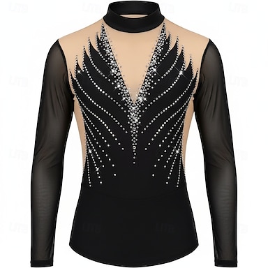 Top da pattinaggio sul ghiaccio da uomo e ragazzo, ad alta elasticità, abbigliamento da pattinaggio per allenamento e competizione, classico, con cristalli/strass, manica lunga, pattinaggio sul