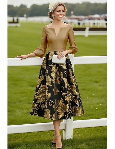 Linea ad A Lunghezza Tè Vestito da Festa Abito da Cocktail Abito da invitata a nozze Abito da cerimonia per signora Manica 3/4 Scollo a V Elegante Minimalista Formale Cocktail party Raso con Stampa