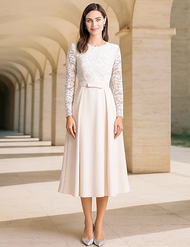 Abito A-Line lunghezza al tè abito da festa abito da cocktail abito da ospite di nozze abito della madre della sposa maniche lunghe scollo a girocollo elegante vintage festa in spandex con pieghe