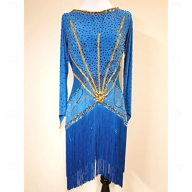 abito da ballo latino da donna, blu reale, strass dorati, maniche lunghe, frange, costume da esibizione per cha cha, samba, rumba