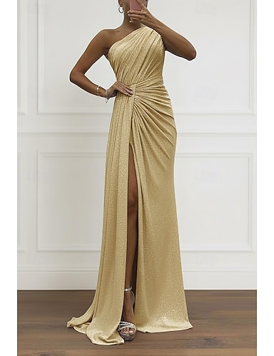 Tubino Colonna Lunghezza al pavimento Abito da Sera Elegante Spacco Alto Senza Maniche Monospalla Matrimonio Formale Jersey Tessuto Lurex con Glitter Spacco